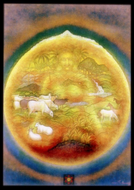 The Dhyana sloka prays to the indestructible (durdasham) Devi Sri adorned by plentiful (pruthulam)   nature (sasya malinim), surrounded by cows (gau vrinda) and the bestower of cows. She indeed is the ruler of all life (praninaam Isham