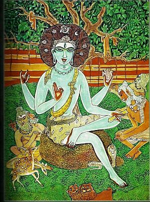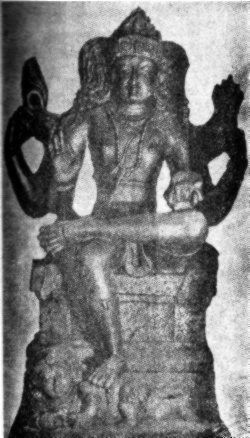 It is said; the full view of the sculpture reveals that the deity is sitting under a banyan tree; the figures of six Rishis are carved on the lower portion of the pedestal; and Nandi with four arms and human body is standing besides the Rishis.