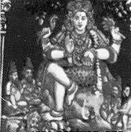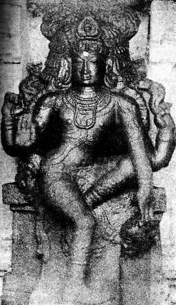 (3) Jata-mandala: Long strands of thick hair woven into three braids are wound in circular forms and held behind on the neck like a disc or a fan. Its other variation is: some braids are let flowing on to shoulder and back. (Shiva)