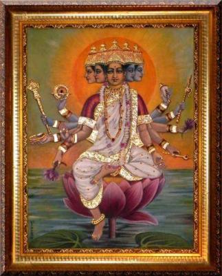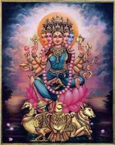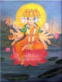 I meditate upon the Goddess Gayatri of five faces tinged with shades of pearl, coral, gold, sapphire, and white. Each of her heads is adorned with three eyes and crescent moon upon her diamond studded crown. She is seated on a lotus. She is endowed with ten arms. She holds in her six hands: the goad, the whip, the white skull, the mace, the conch and the discus; as also two lotuses in two other hands. With the other hands she gestures protection (abhaya mudra) and granting blessings (varada mudra).She is the very embodiment of mystic utterances of great philosophical import.