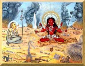48.4. The image of Bagalamukhi sitting upon a corpse is also said to be associated with the extreme tantric ritual of Shava-sadhana. It is a ritual where the adept (sadhaka) sits upon the chest of a fresh corpse at the dead of the night in middle of cremation ground and tries to overcome or control the dead person’s preta (spirit).Through that he hopes to gain magical powers.The esoteric view of this tantric ritual is that it transforms the aspirant, awakening in him or her to an expanded consciousness; and grants him a new identity.