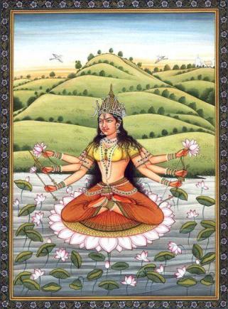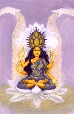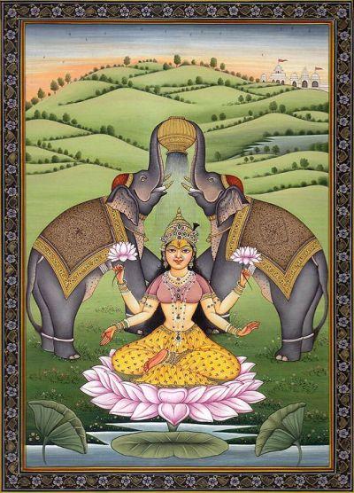 “She has a beautiful golden complexion. She is being bathed by four large elephants who pour jars of nectar over her. In her four hands she holds two lotuses and makes the signs of granting boons and giving assurance. She wears a resplendent crown and a silken dress. I pay obeisance to Her who is seated on a lotus in a lotus posture.”