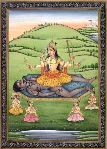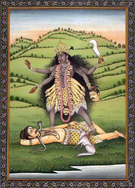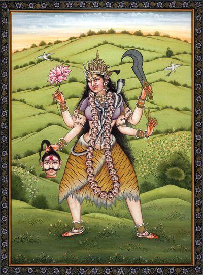 She is depicted as a domineering, fearful tantric deity, who is outside the pale of the traditional society; who wields magical powers; who is pleased with the offering of leftovers and polluted things; and who enjoys sex.