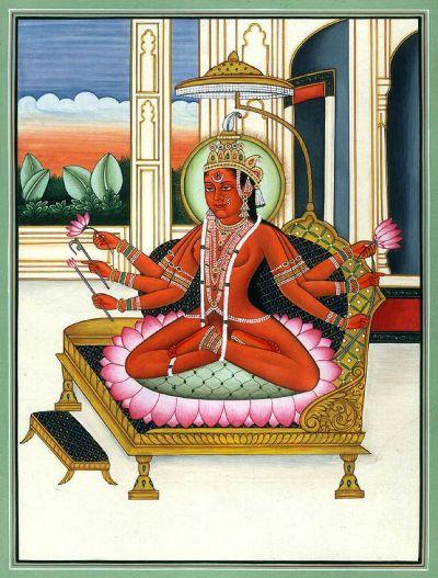 50.4. Another description says: Matangi is blue in color and dressed in red. Her waist is slim and her breasts well-developed. The crescent moon adorns her forehead. She has three eyes and a smiling face. She is bejewelled and is seated on a lotus throne. In her four arms, she carries a skull, a sword, and a veena. She is Modini the goddess who grants worldly pleasures.