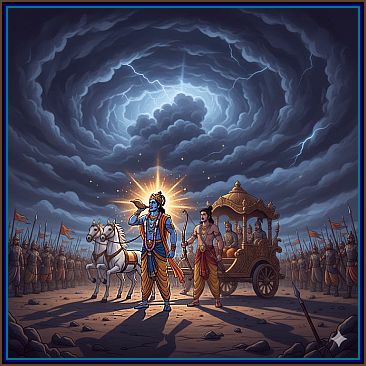 The Gita we overhear is essentially that which is narrated by a man with no authority but with a distant sight (Sanjaya) to a man with no sight but with full authority (Dhritarashtra). This peculiar structure of the narrative draws attention to the vast gap between what is told and what is heard.