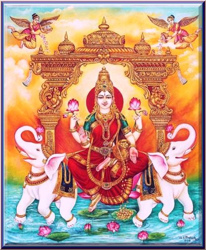46.1. The Dhyana sloka of the mantra is dedicated to Lakshmi the daughter of sage Bhrigu; Mother of all existence , glowing with a benign smile on her joyful face; bright as gold ;adorned with rich ornaments ; seated upon a royal throne ; holding the royal signs of sceptre ; served by all ; worshipped by Agni; blessing the whole world ; and, conferring happiness and prosperity on all beings and nature.