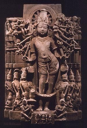 There is also an unusual form of Vishnu in shayana posture. The Abhicharika shayana does not have the serpent bed or the Brahma. Vishnu is reclining on the floor; he looks emaciated too. Such an inauspicious form of Vishnu is employed in Tantric worship; and it should not be located where people especially where women and children dwell.